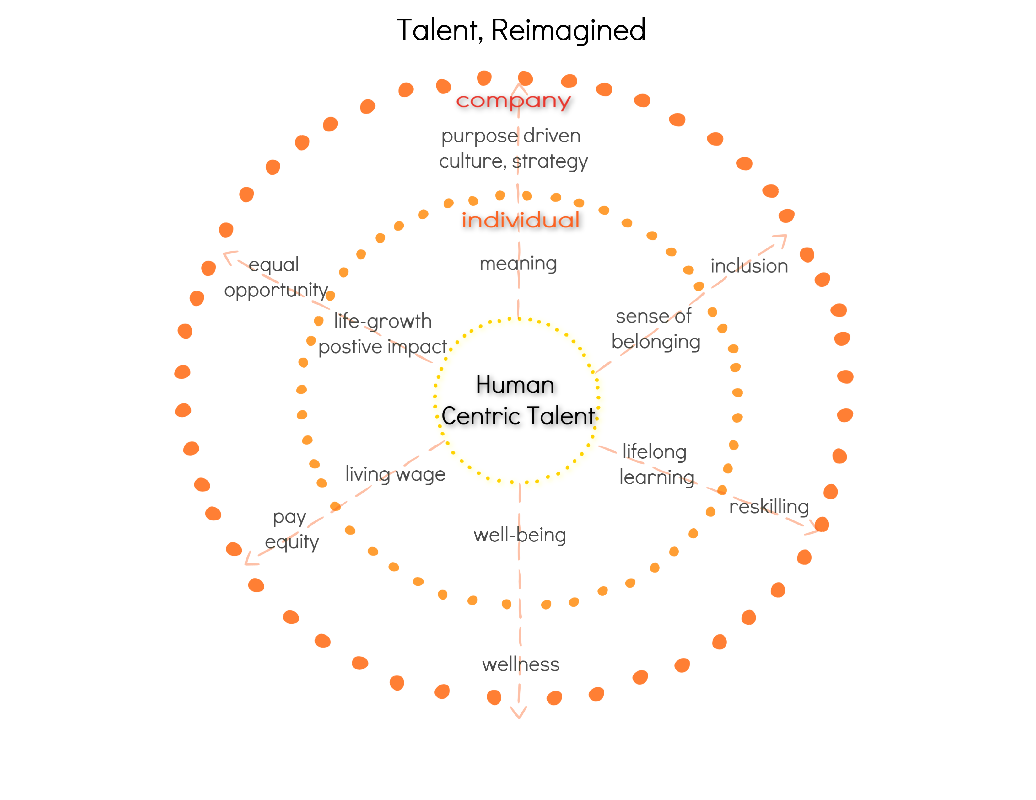 In today’s world, talent strategy is driven by the enterprise. We assess what’s needed to deliver our business strategy, identify the gaps, and develop plans to fill those gaps. Today, talent is enterprise centric, where the needs of the entity outweigh the needs of the employee. In the new world of work, potential employees will seek meaning, a sense of belonging and connection as the workplace automates around us all. Talent practices will become more human centric. For any enterprise to remain competitive, and for society as we know it to remain healthy and sustainable, we will need to put people first.